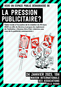 Genève Sans Pub organise une table ronde en collaboration avec le Courrier, le mardi 24 janvier, à l’occasion de la votation du 12 mars 2023 en…
