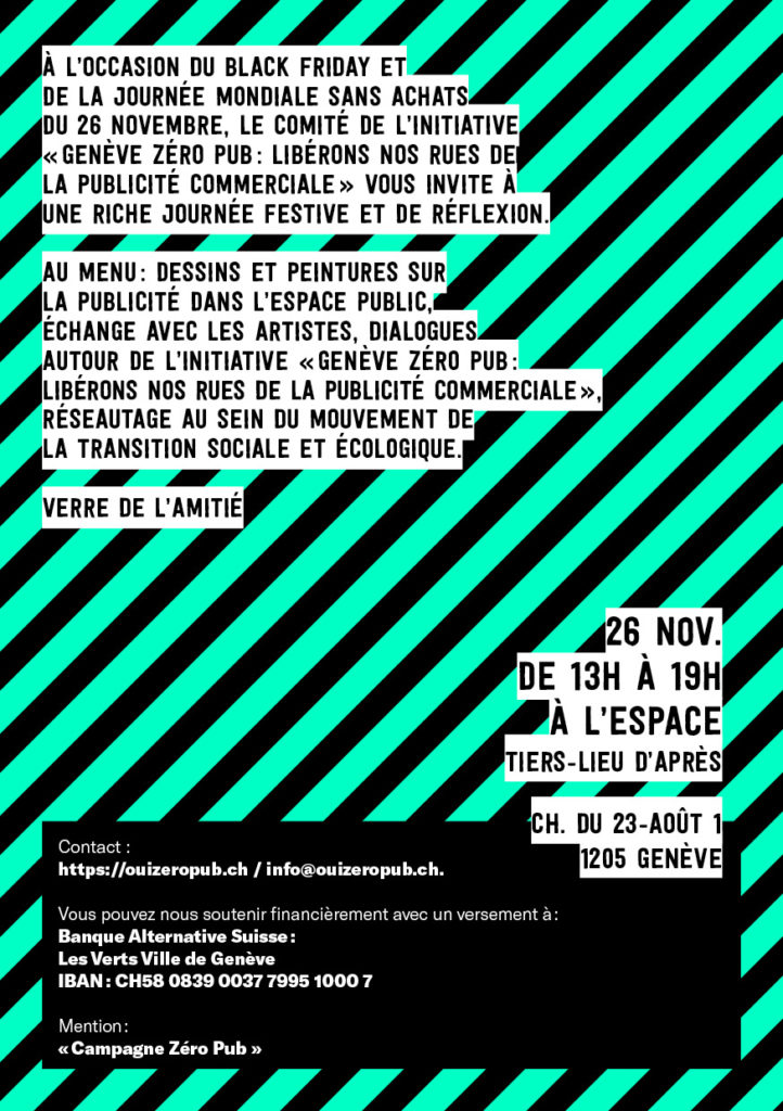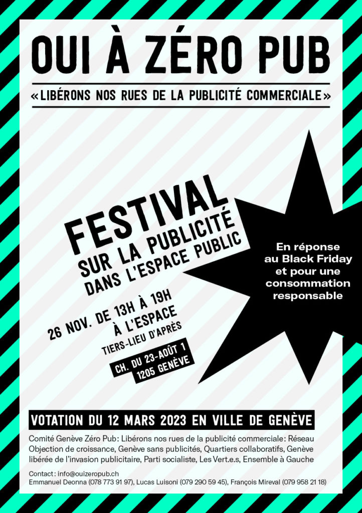 Le Comité Genève Zéro Pub lance la campagne pour la votation du 12 mars prochain au sujet de l’interdiction de la publicité commerciale par voie d’affichage en ville de Genève, ce samedi 26 novembre à l’occasion du Festival sur la publicité dans l’espace public qui aura lieu à l’Espace.