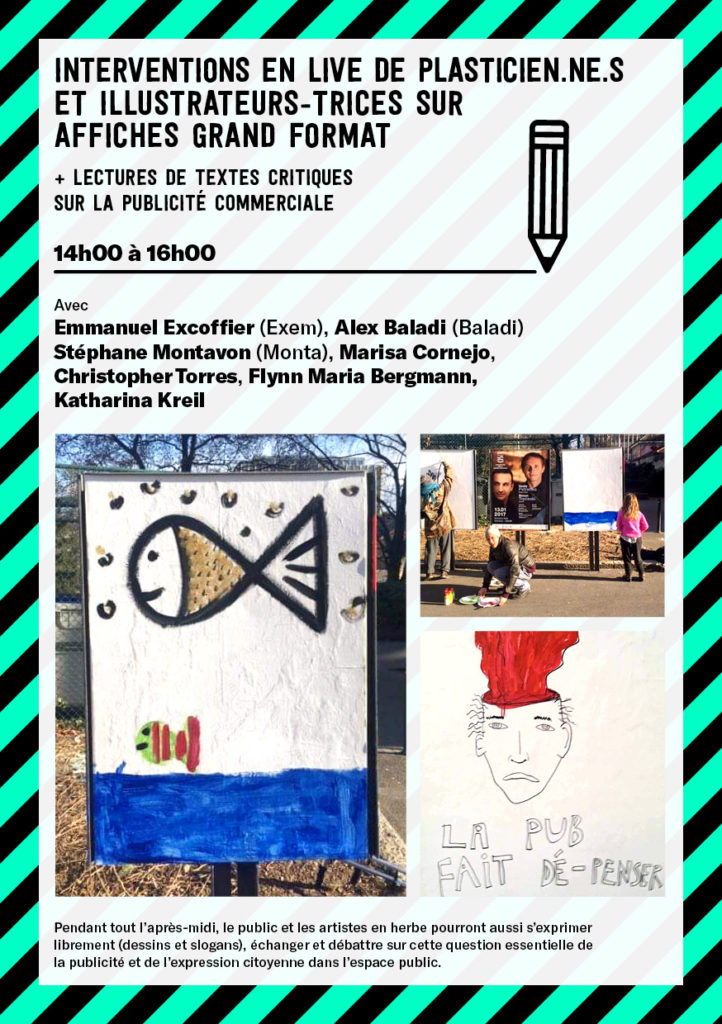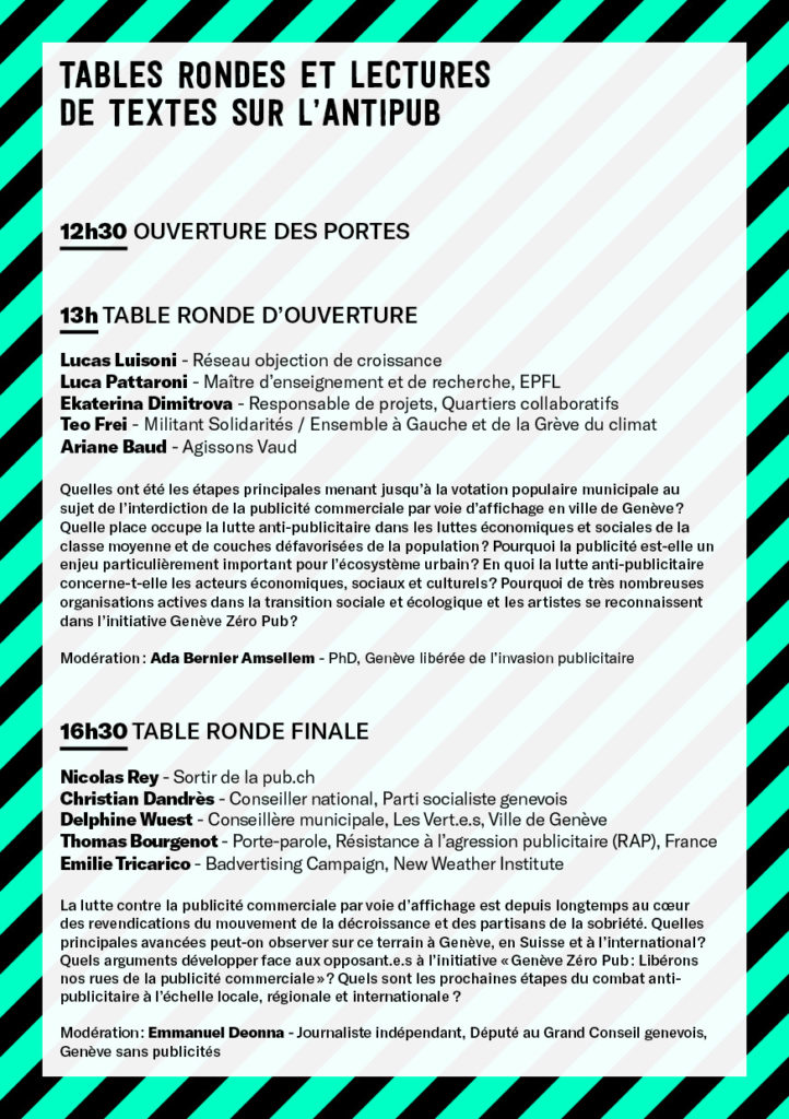 - 13h : Table ronde d’ouverture sur l’historique genevois de la lutte anti-pub, avec Lucas Luisoni du Réseau objection de croissance, Luca Pattaroni, Maître d’enseignement et de recherche à l’EPFL, Ekaterina Dimitrova de Quartiers collaboratifs, Teo Frei, Militant Solidarité/Ensemble à Gauche et de la Grève du climat et Ariane Baud, d’Agissons Vaud, modérée par Ada Bernier Amsellem de Genève libérée de l’invasion publicitaire.