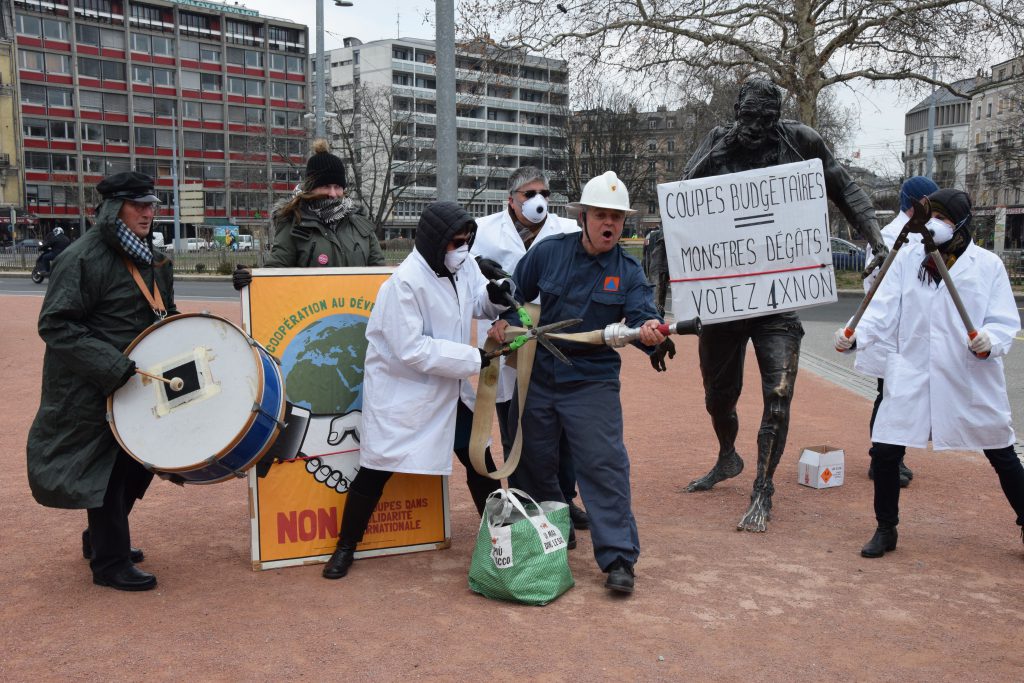 Une action coup-de-poing des partisans du 4x non aux coupes s’est déroulée à midi à Plainpalais.
